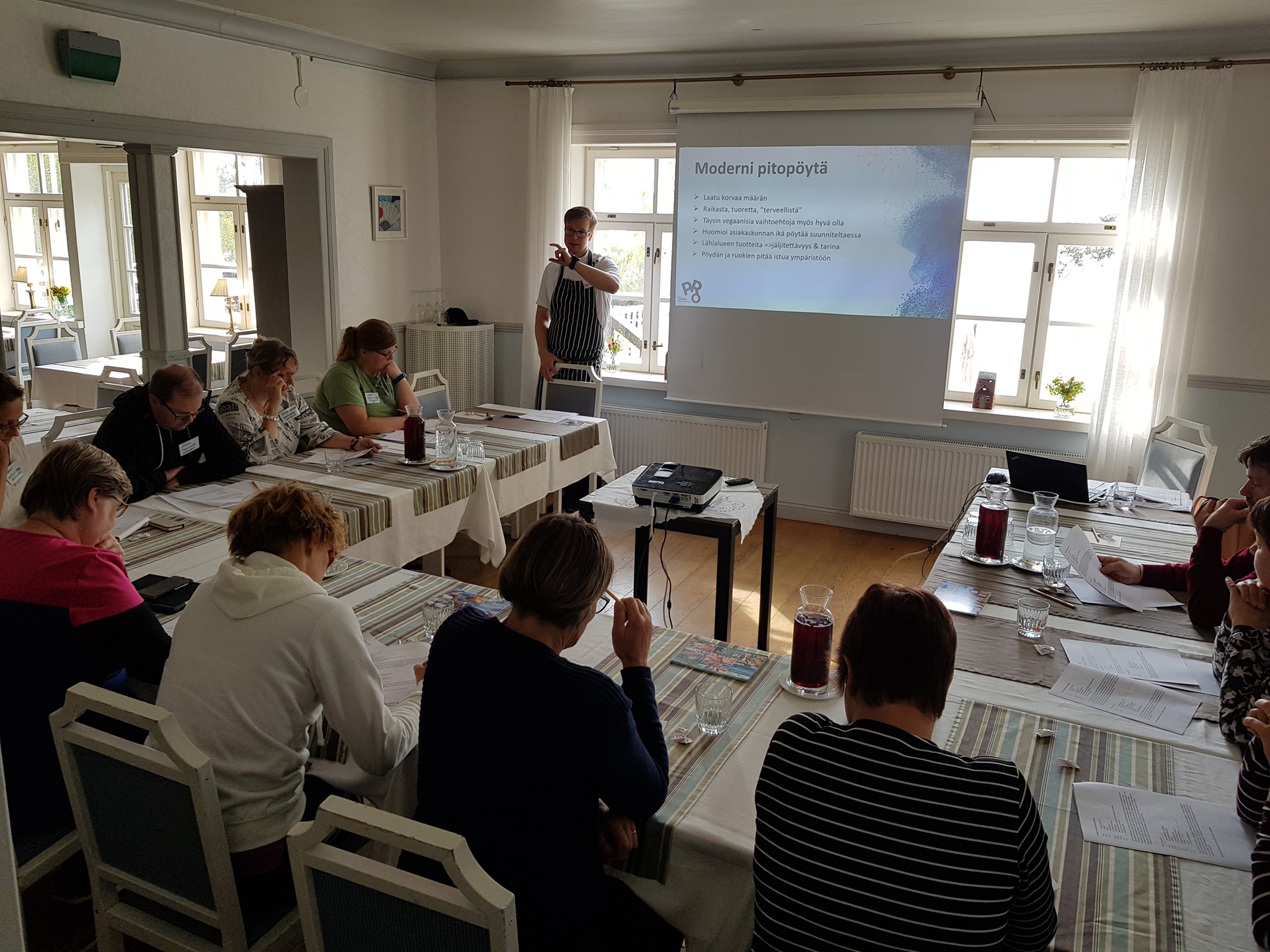 Ensimmäinen kehittämisteema pureutui maaseudun matkailuyrityksissä melko yleisen perinteisen pitopöydän tuunaamiseen uudella twistillä tähän päivään kuitenkin perinteitä myös kunnioittaen. Nykyajan asiakkaan odotukset ja mieltymyksetkin ovat muuttuneet vuosien saatossa. Nyt arvostetaan määrän sijasta laatua ja erilaiset kasvipohjaiset vaihtoehdot ovat lisänneet suosiotaan. Yksi asia, josta ei edelleenkään haluta tinkiä on maku. Eikä tingitty nytkään. Pitopöytä valmistettiin yhdessä tehden Perho Pron Olli Takasen johdolla ja ammattimaisella opastuksella. Ensin perehdyttiin reseptiikkaan ja siinä käytettäviin lähialueella tuotettuihin raaka-aineisiin. Sahanlahti Resort sopi ruokamatkailun kehittämispäivään enemmän kuin hyvin, sillä se on yksi tämän vuoden Hungry for Finlandin Ruokamatkailukilpailun voittajayrityksistä yhdessä kolmen muun Saimaa Gastronomy-verkostoon kuuluvan ruokamatkailuyrityksen kanssa. Menut kussakin yrityksessä rakentuvat kausituotteista ja siksi pöydän antimet vaihtuvat vuodenaikojen ja jopa päivän sään mukaan. Kehittämispäivän osallistujat pääsivät kuulemaan myös Sahanlahden tarinaa ja yhteistyöstä paikallisten tuottajien ja matkailuyritysten kesken yrittäjä Jaana Kuivalaiselta.